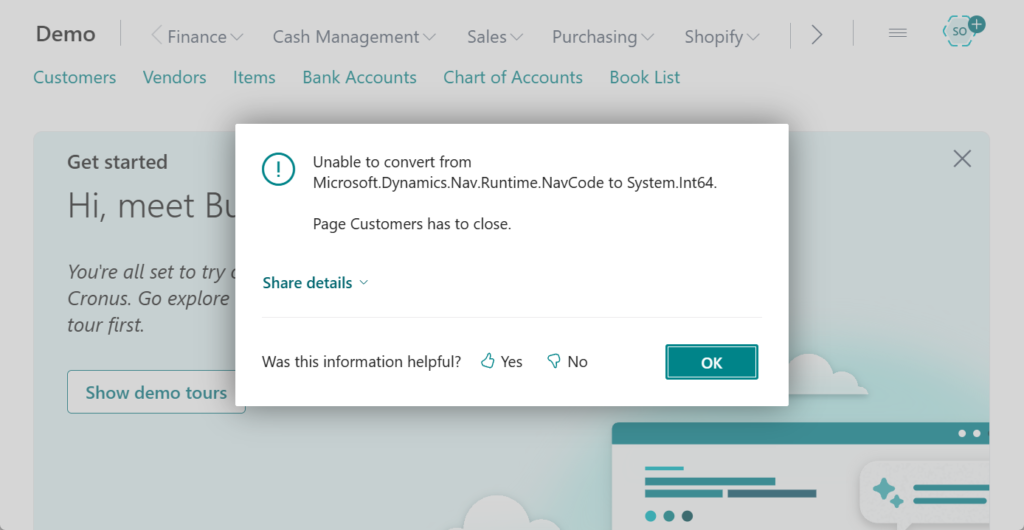 Unable to convert from Microsoft.Dynamics.Nav.Runtime.NavCode to System.Int64. Page Customers has to close.