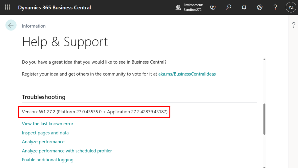 You can use the information about which version the tenant is on to help you troubleshoot an issue that a user reported, for example. This information is listed in the Troubleshooting section of the Help and Support page in Business Central in the following format: