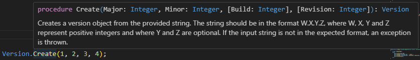 | Create(Text) | Creates a version object from the provided string. The string should be in the format W.X.Y.Z, where W, X, Y and Z represent positive integers and where Y and Z are optional. If the input string is not in the expected format, an exception is thrown. |