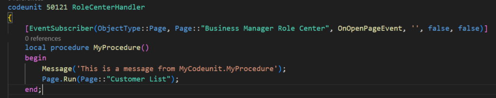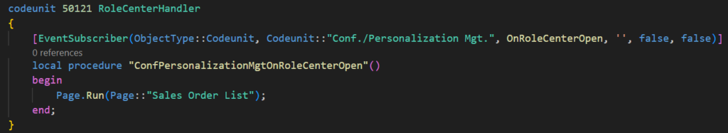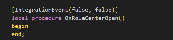 [EventSubscriber(ObjectType::Codeunit, Codeunit::"Conf./Personalization Mgt.", OnRoleCenterOpen, '', false, false)]