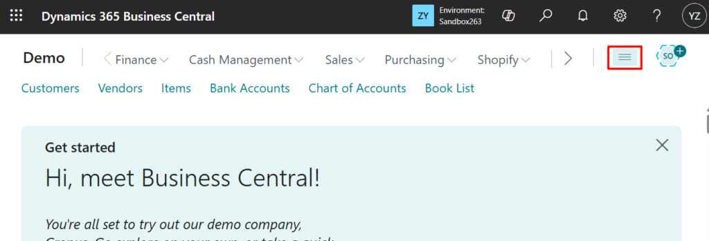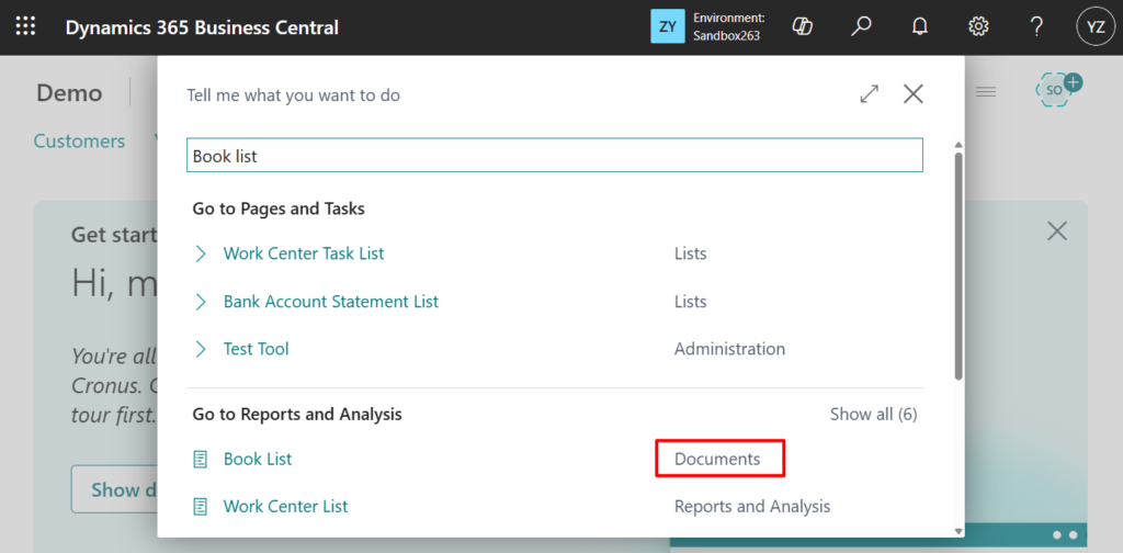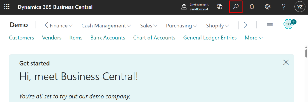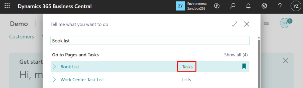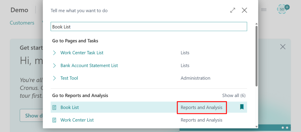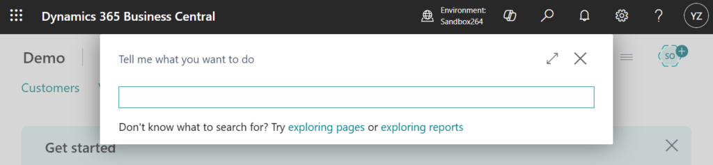 The Business Central client includes the Tell me feature that lets users find objects by entering search terms.