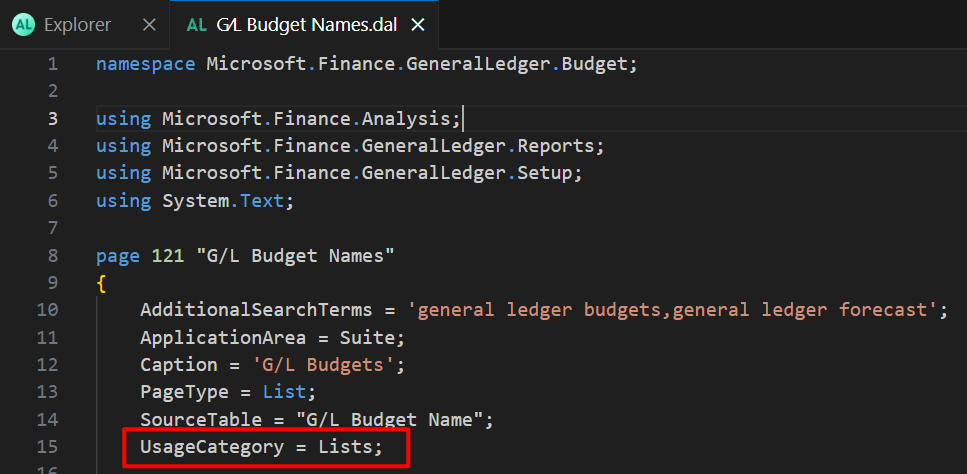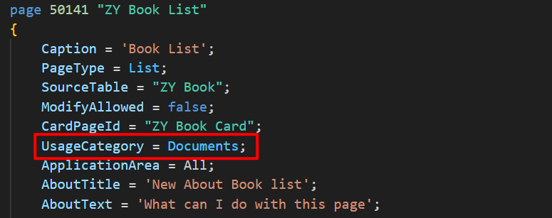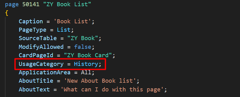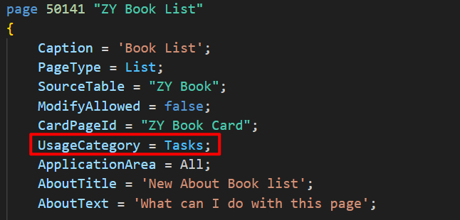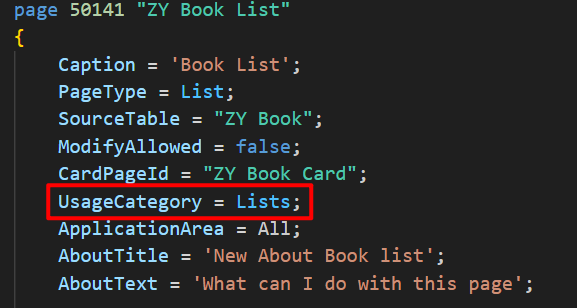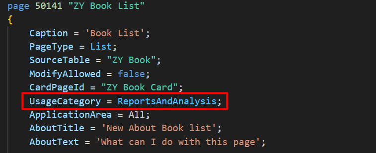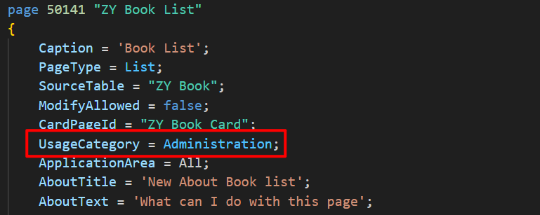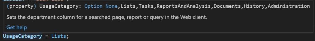 UsageCategory property: Sets the department column for a searched page, report, or query in the web client. If the UsageCategory is set to None, or if you don’t specify UsageCategory, the page, report, or query doesn’t show up when you search in Dynamics 365 Business Central.