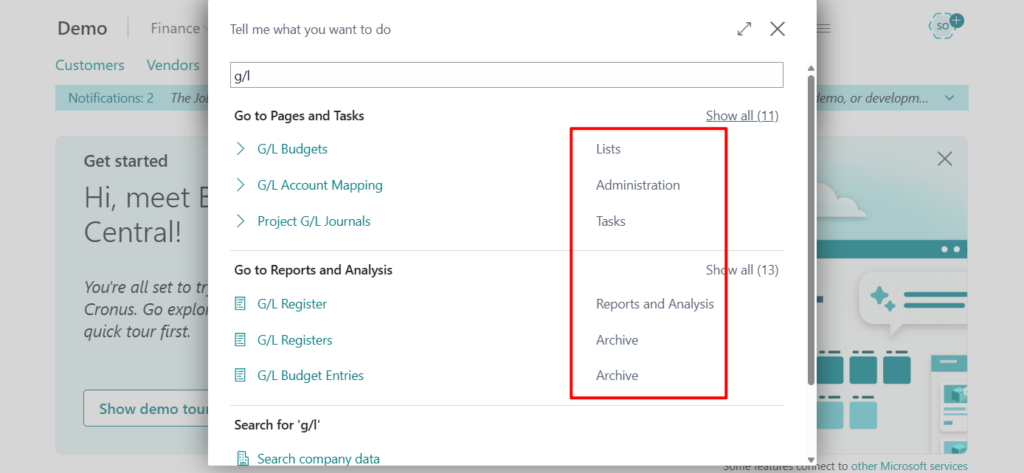 Today I would like to briefly talk about the question I saw in the Business Central forum before, what does the category (Lists, Tasks, Administration, Archive……) mean when searching from Tell Me? (Usage Category), more details: What does Archive means in Business Central when searching for General Ledger Entries?