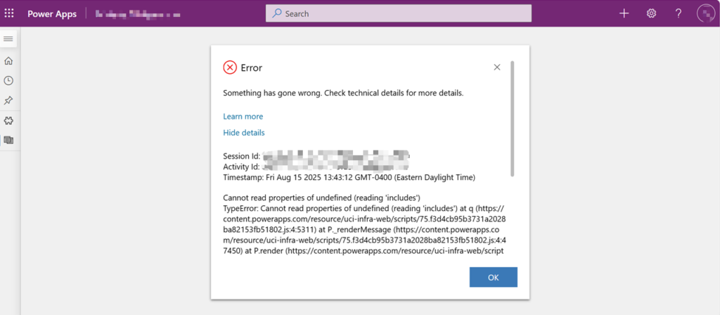 Error Code: runtimeCanvasAppError