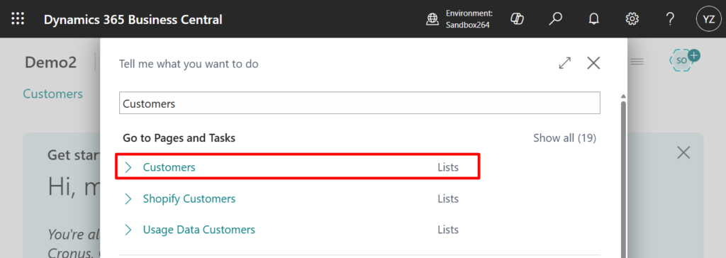 1. Select Tell Me (Alt+Q) in the upper-right corner, enter Customers, and then choose the related link.