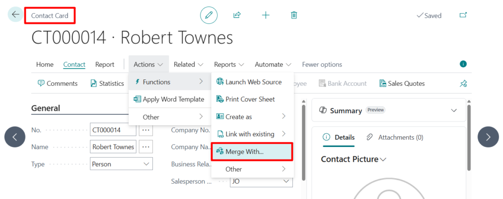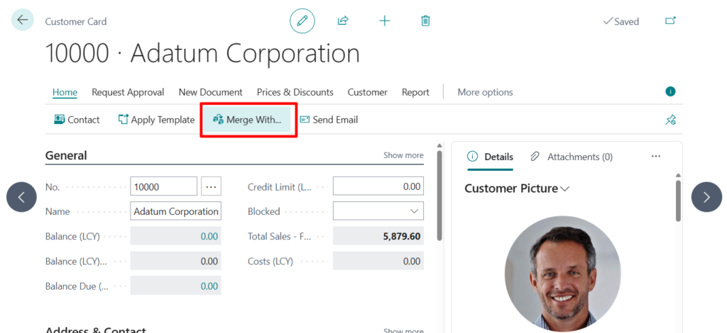 3. On the Customer Card page, choose the Merge With action.