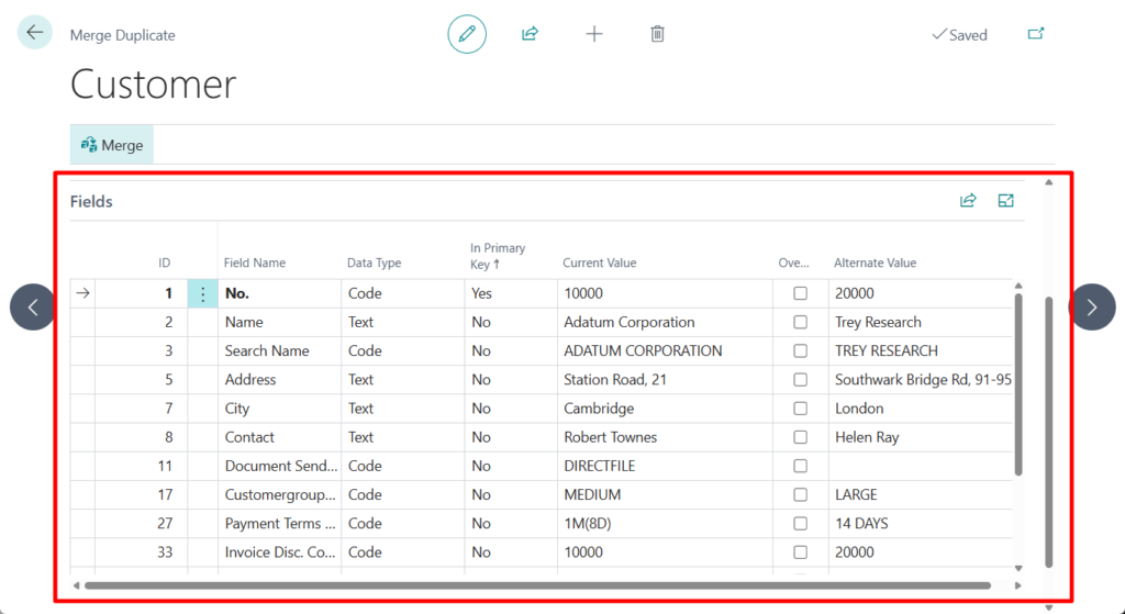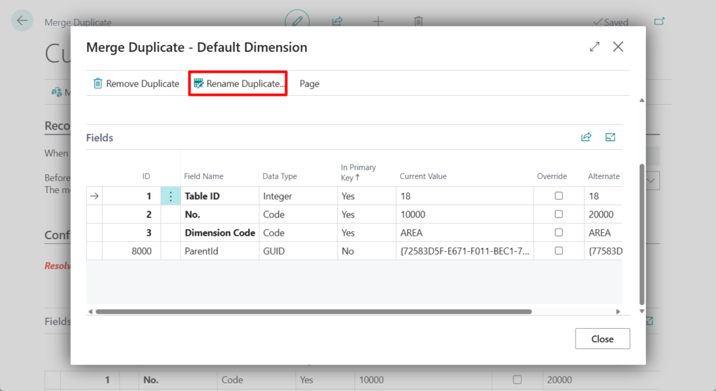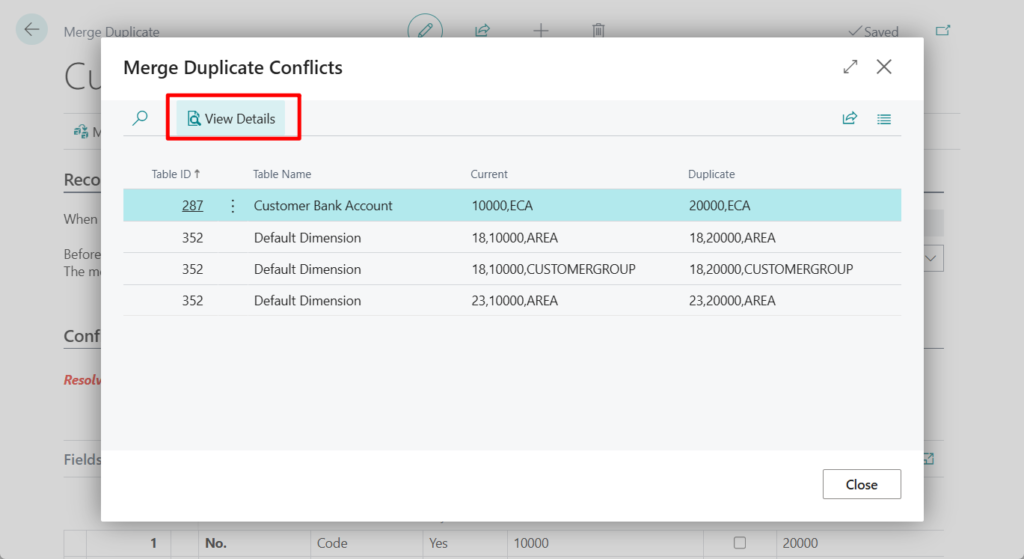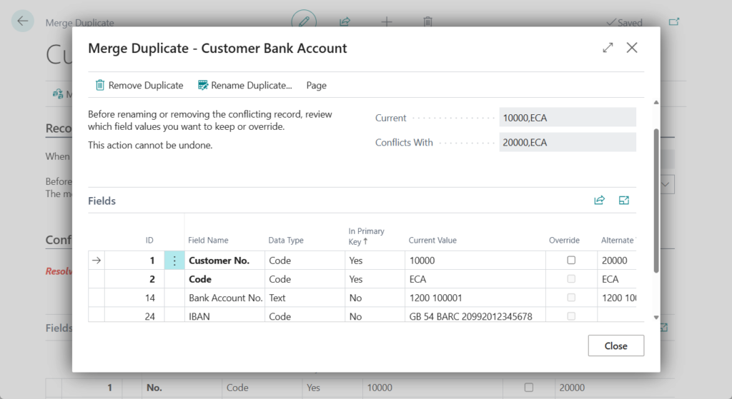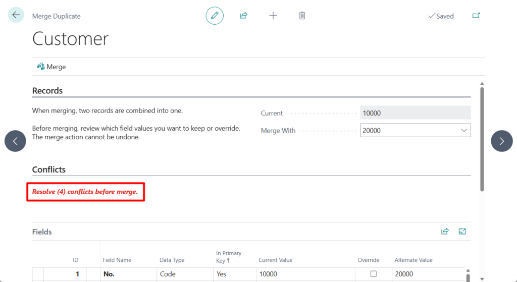 Business Central checks whether the merge of values for the duplicate customer into the current customer causes conflicts. A conflict exists if a value in at least one primary-key field is the same for both customers while the value in the No field is different for the two customers.