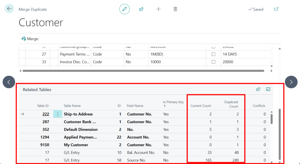 The Related Tables FastTab lists tables where there are fields with a relation to both customers. The Current Count and Duplicate Count fields show the number of fields in related tables where the No. value of both the current and the duplicate customer is used. On the Merge Duplicate page, this section is informational only. However, if there are merge conflicts, you can resolve them on the Merge Duplicate Conflicts page.