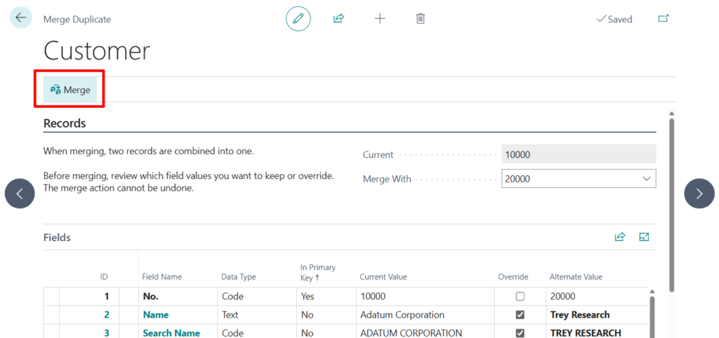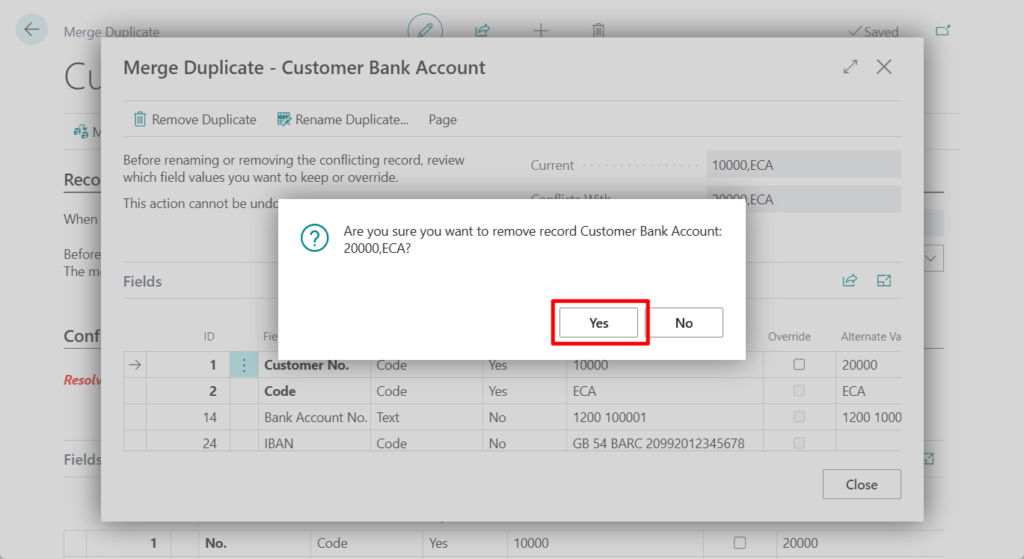 10. On the Merge Duplicate page, choose the Merge action again. If no conflicts are found, choose the Yes button in the confirmation message.The duplicate customer is renamed so that all use of its No. value in all fields with relations to the customer table are replaced with the No. value of the current customer.
