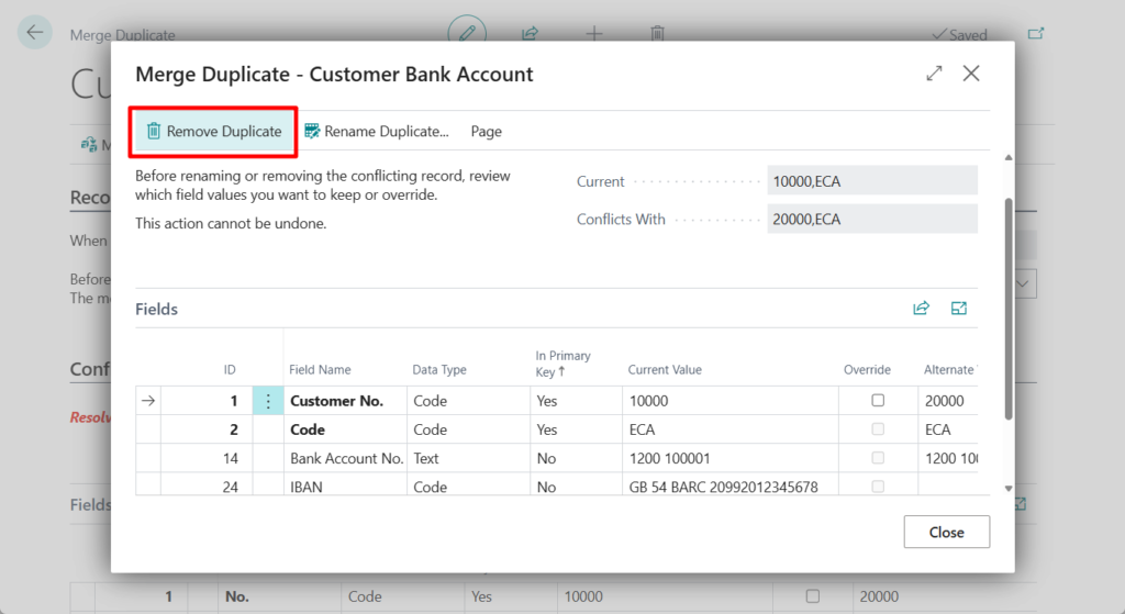 9. If you don’t want to keep the duplicate customer record, choose the Remove Duplicate action, and then choose the Close button.
