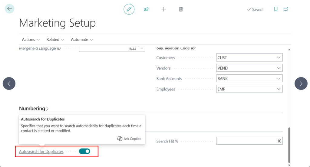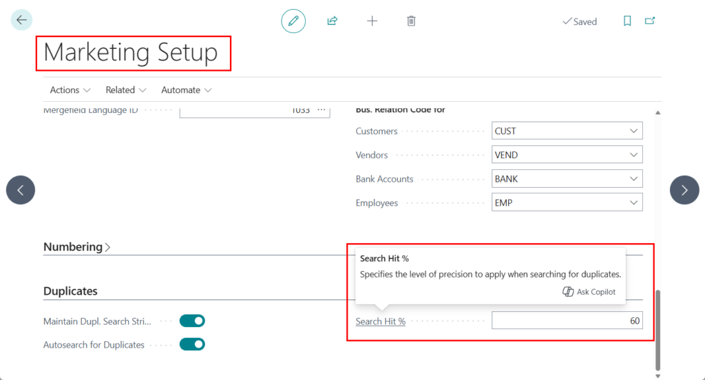 Let’s see more details. First you can specify the percentage of identical data that two contacts must have in order to consider them duplicates. You can also just use the default percentage, which is 60. You specify the percentage on the Marketing Setup page by entering a percentage value in the Search Hit % field on the Duplicates FastTab.
