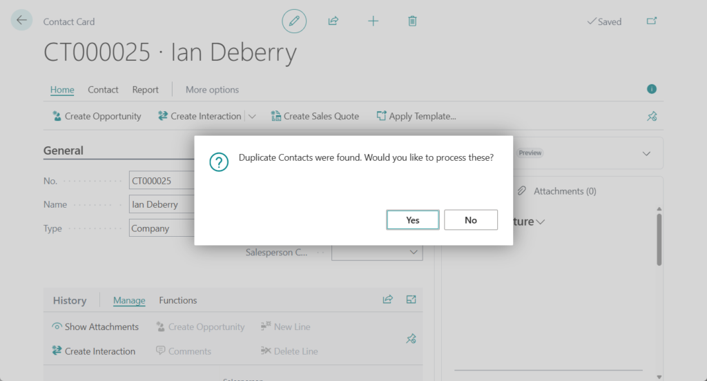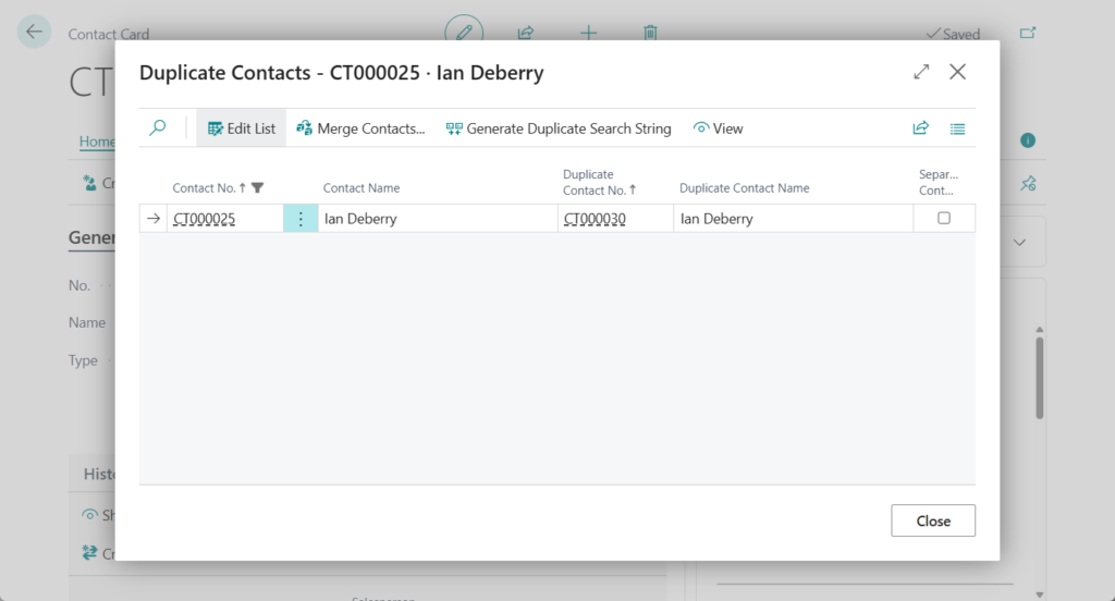 When you create a contact, Business Central can automatically search for duplicates. Avoiding duplicate contacts can help ensure that you interact with the right person for the right company.