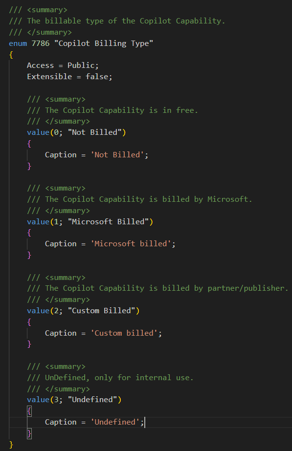 This indicates whether consumption is billed by Microsoft, custom-billed by a partner, or not consumption-billed. A capability can be billed by Microsoft either if it’s delivered by Microsoft, or if the partner building the capability has chosen to opt in to using Business Central AI resources. Learn more in Business Central AI resources.