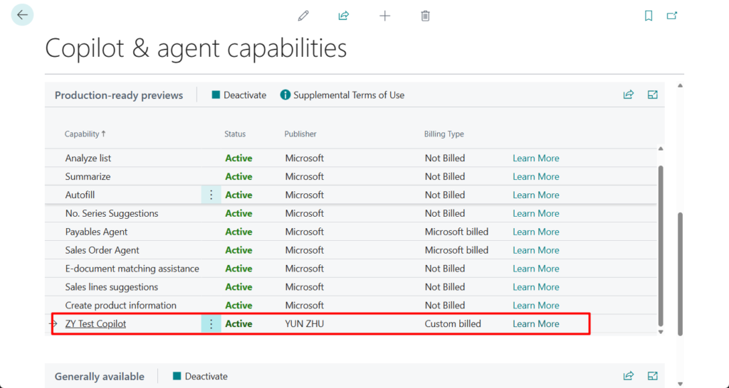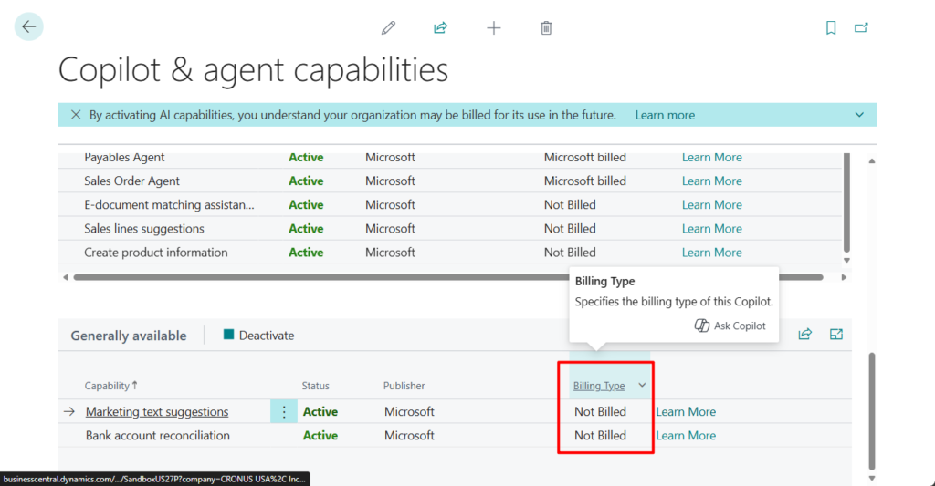 With this wave (BC27), a new Billing Type column is added in the Copilot and Agent Capabilities page.