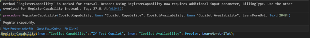 Method ‘RegisterCapability’ is marked for removal. Reason: Using RegisterCapability now requires additional input parameter, BillingType. Use the other overload for RegisterCapability instead.. Tag: 27.0.AL AL0432