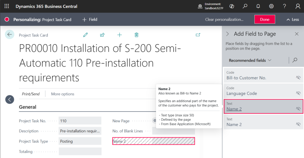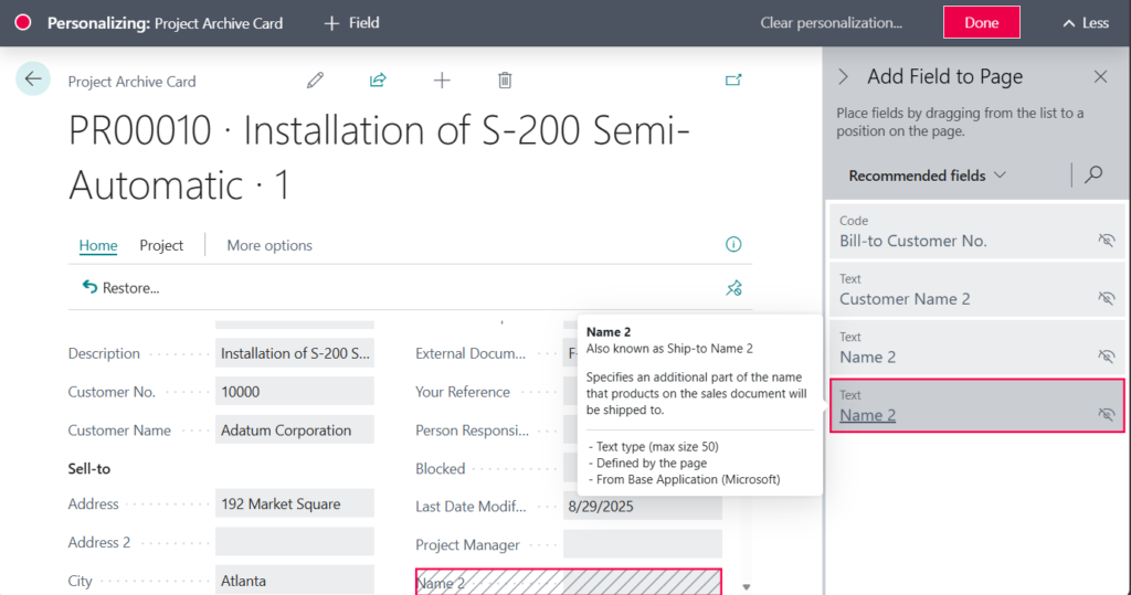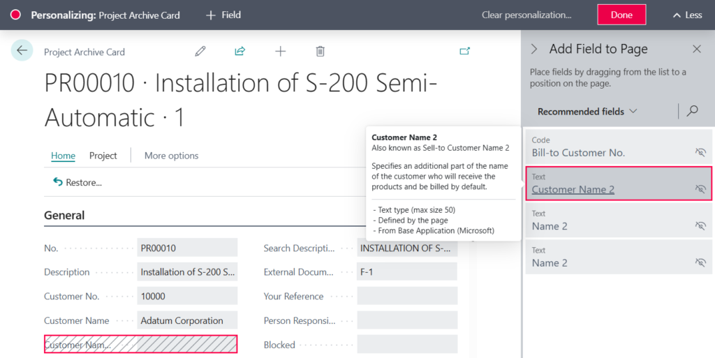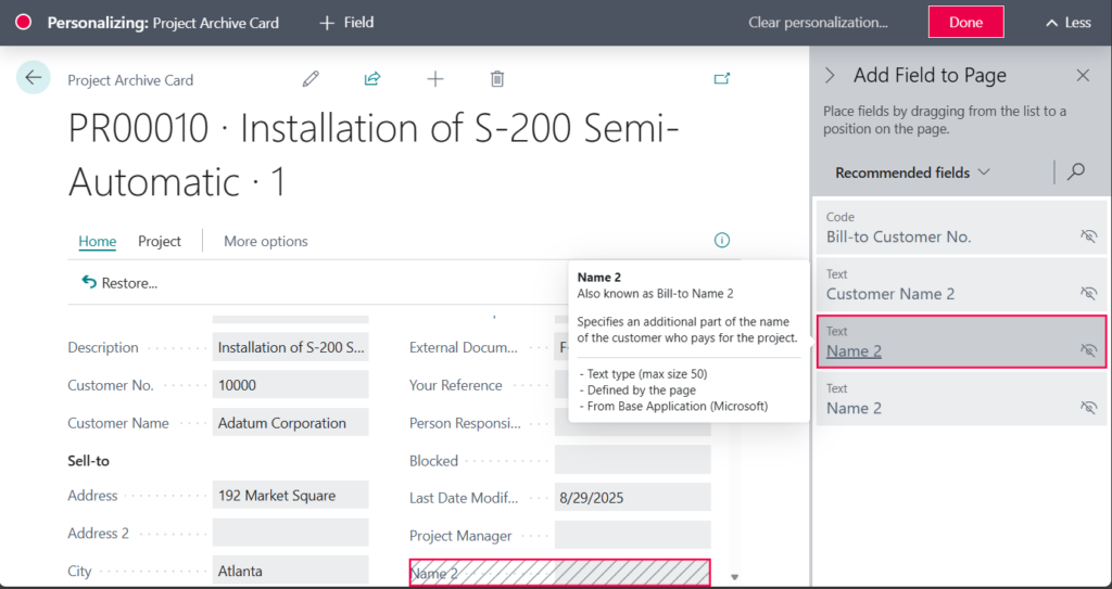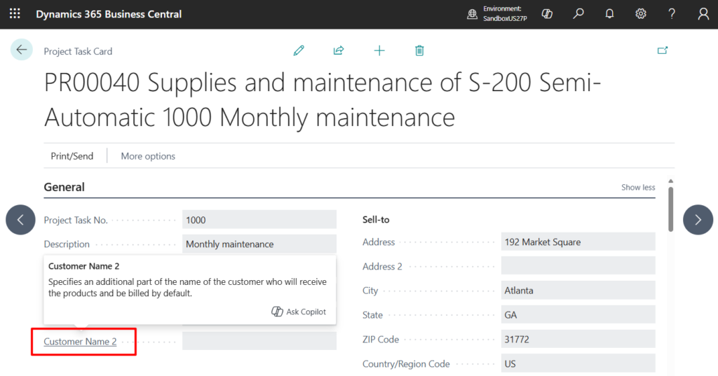 Sell-to Customer Name 2, Bill-to Name 2 on project documents