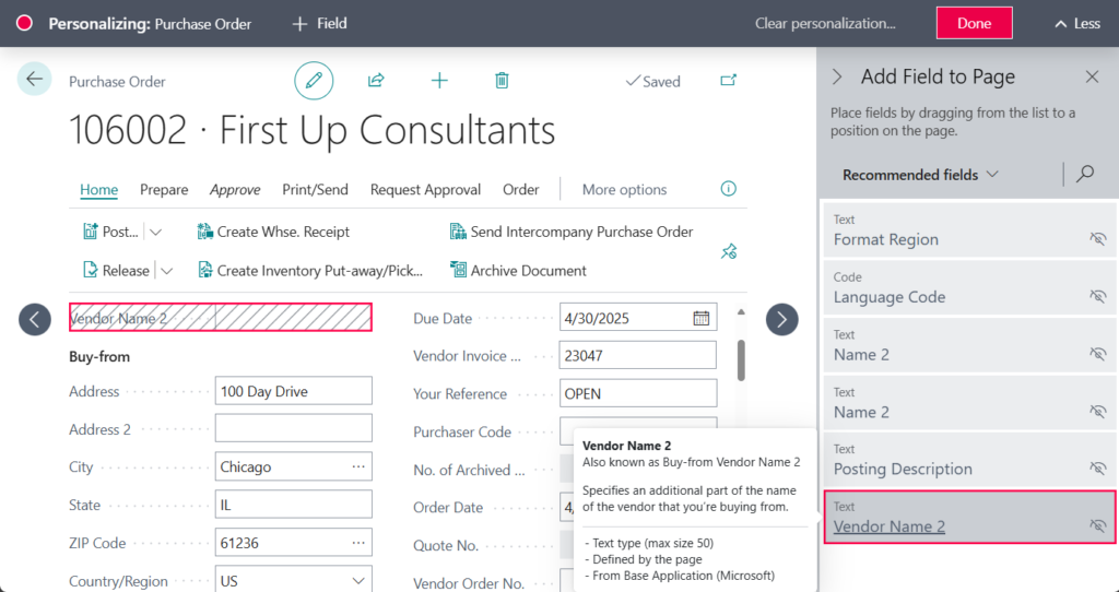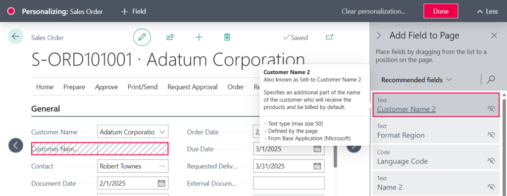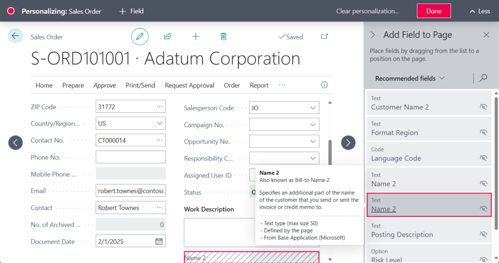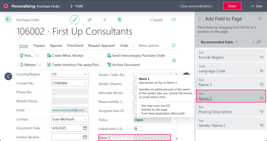 Different businesses and users need specific information to complete their processes efficiently. Personalization in Business Central is a powerful tool that lets you tailor the information on your pages by adding fields or columns from a set list. You can now choose from even more fields and columns to add to some pages. This enhancement is driven by community feedback, addressing a common request and giving you greater control over the information displayed. It helps you work more effectively with the data that’s most important to your business operations.