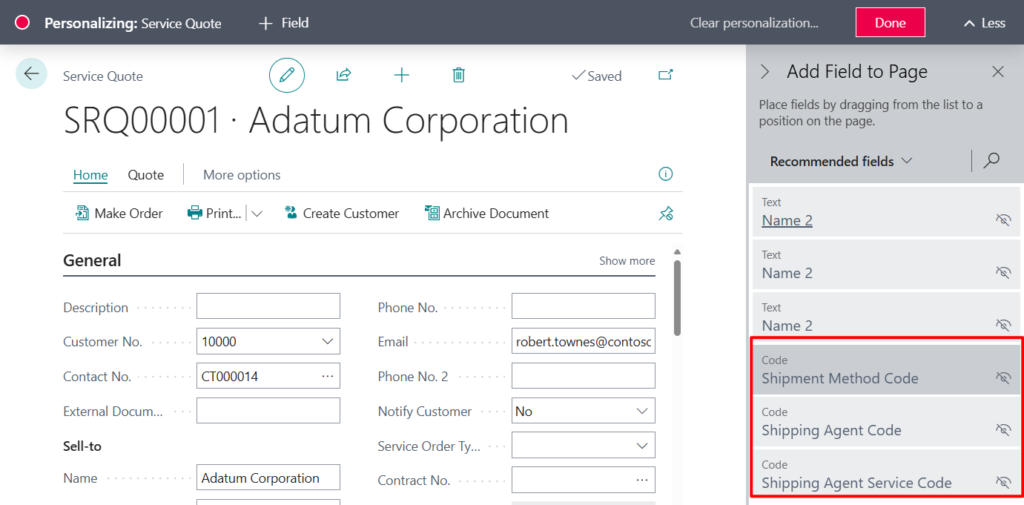 Use personalization to add Shipment Method Code, Shipping Agent Code, and Shipping Agent Service Code fields on the Service Quote page.