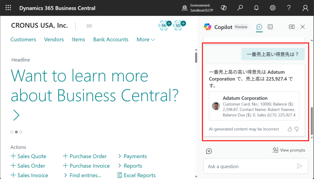 - Find business data for your company in Business Central. Use chat to look up and open data about entities or records related to business processes, such as customers, vendors, sales orders, and items. For example, ask: “Show me the latest sales order for Adatum”.Copilot can also organize data for you. Just ask it to group records or do calculations like adding or averaging, and it generates an analysis tab, displaying the results.