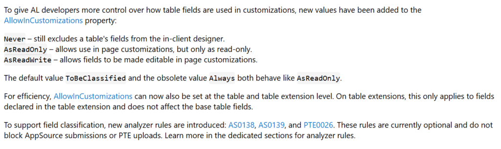 To support field classification, new analyzer rules are introduced: AS0138AS0139, and PTE0026. These rules are currently optional and do not block AppSource submissions or PTE uploads. Learn more in the dedicated sections for analyzer rules.
