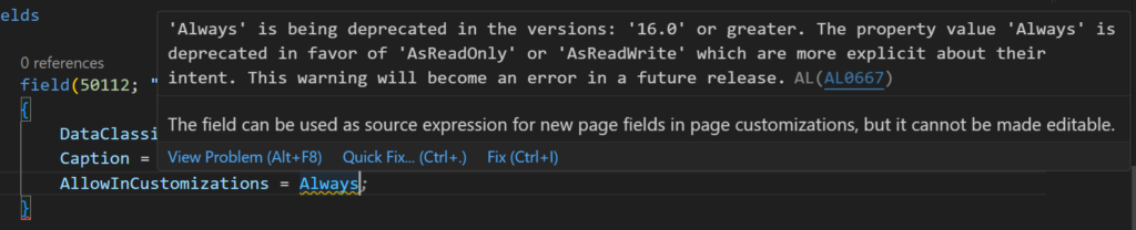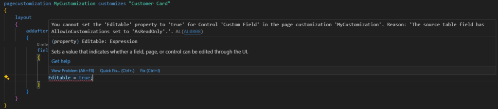 You cannot set the ‘Editable’ property to ‘true’ for Control ‘Custom Field’ in the page customization ‘MyCustomization’. Reason: ‘The source table field has AllowInCustomizations set to ‘AsReadOnly’.’. AL AL0808