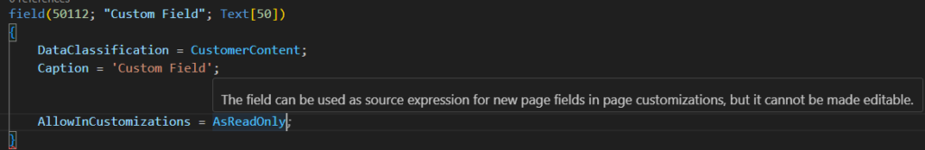 In Business Central 2023 wave 2 (BC23), a new property AllowInCustomizations was introduced for table fields in order to specify whether they can be used as source expression for page fields created in page customizations. By default, table fields can be used as source expression for page fields created in page customizations.