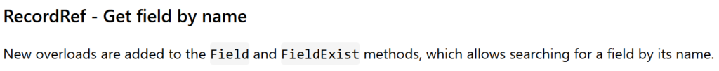 I will continue to test and share some new features that I hope will be helpful. In this post, I would like to talk about RecordRef – Get field by name (New overloads).