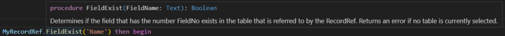 RecordRef.FieldExist(Integer) Method: Determines if the field that has the number FieldNo exists in the table that is referred to by the RecordRef. Returns an error if no table is currently selected.