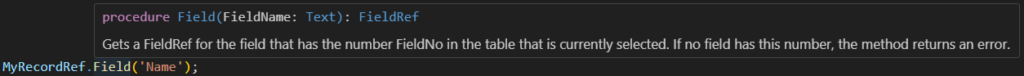 RecordRef.Field(Integer) Method: Gets a FieldRef for the field that has the number FieldNo in the table that is currently selected. If no field has this number, the method returns an error.