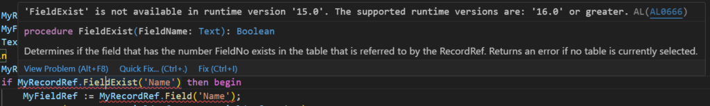 ‘FieldExist’ is not available in runtime version ‘15.0’. The supported runtime versions are: ‘16.0’ or greater. AL AL0666