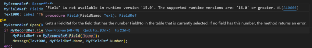 ‘Field’ is not available in runtime version ‘15.0’. The supported runtime versions are: ‘16.0’ or greater. AL AL0666