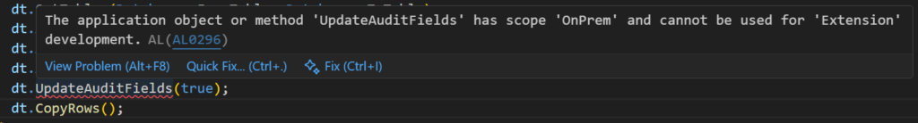 The application object or method ‘UpdateAuditFields’ has scope ‘OnPrem’ and cannot be used for ‘Extension’ development. AL AL0296
