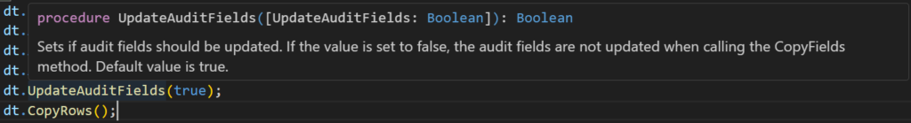 DataTransfer.UpdateAuditFields([Boolean]) Method: Sets if audit fields should be updated. If the value is set to false, the audit fields are not updated when calling the CopyFields method. Default value is true.