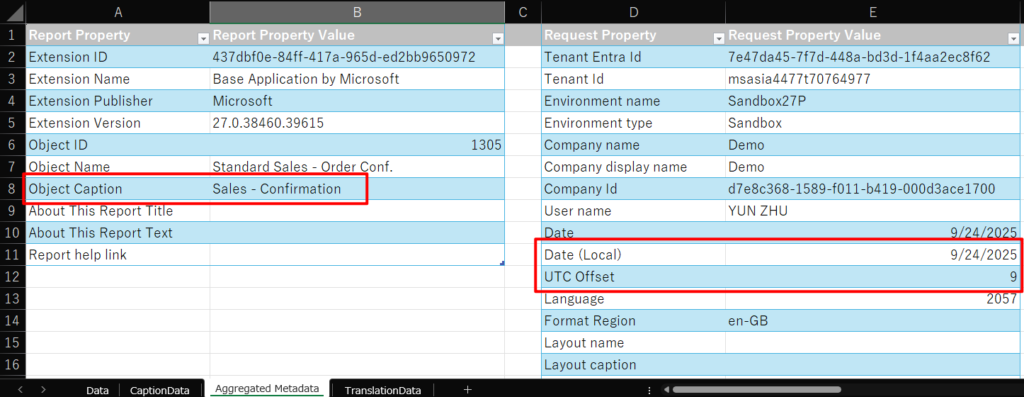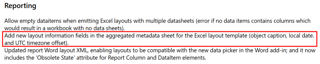 With this wave (BC27), Microsoft added new layout information fields in the aggregated metadata sheet for the Excel layout template (Object caption, Local date. and UTC timezone offset).