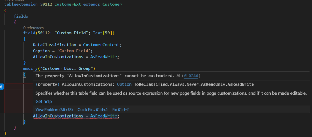 The property ‘AllowInCustomizations’ cannot be customized. AL AL0246