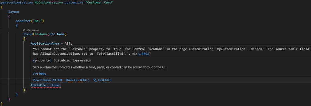 You cannot set the ‘Editable’ property to ‘true’ for Control ‘NewName’ in the page customization ‘MyCustomization’. Reason: ‘The source table field has AllowInCustomizations set to ‘ToBeClassified’.’. AL AL0808