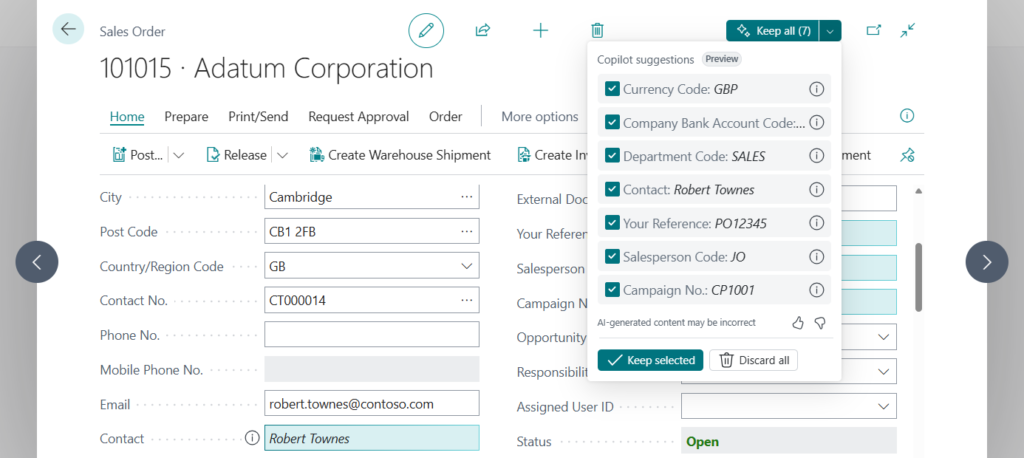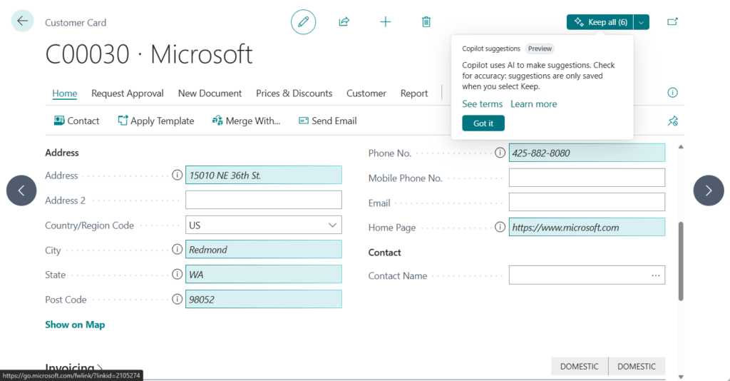 Entering data can take a lot of time and lead to errors. This challenge affects both casual users of Business Central and expert users who enter record after record during their workday. Microsoft Copilot is an AI-powered assistant for work that helps spark creativity, boost productivity, and eliminate tedious tasks. Copilot now suggests appropriate field values so you can choose to keep them instead of typing.