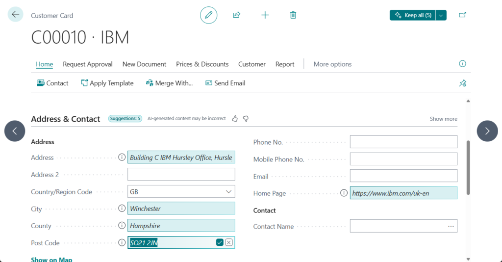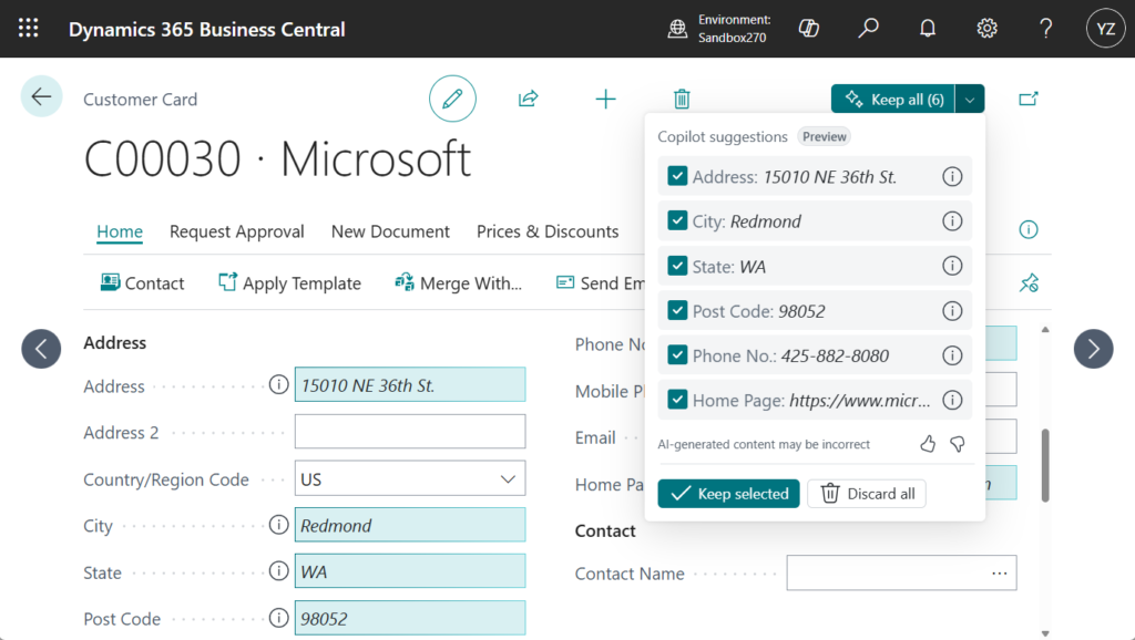 Copilot now automatically searches the web for information and provides suggestions for customer or vendor contact details such as address, phone, email, and website. It can also use a web search to autofill similar fields that typically contain publicly available information.