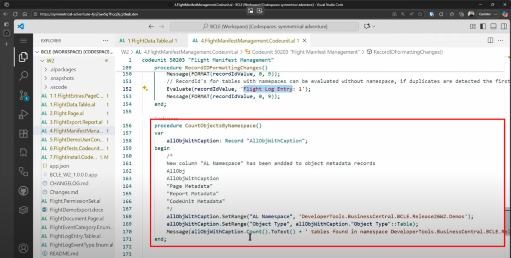 I will continue to test and share some new features that I hope will be helpful. In this post, I would like to talk about New field “AL Namespace” has been added to object metadata record (AllObj, AllObjWithCaption, Page Metadata, Report Metadata, and Codeunit Metadata).