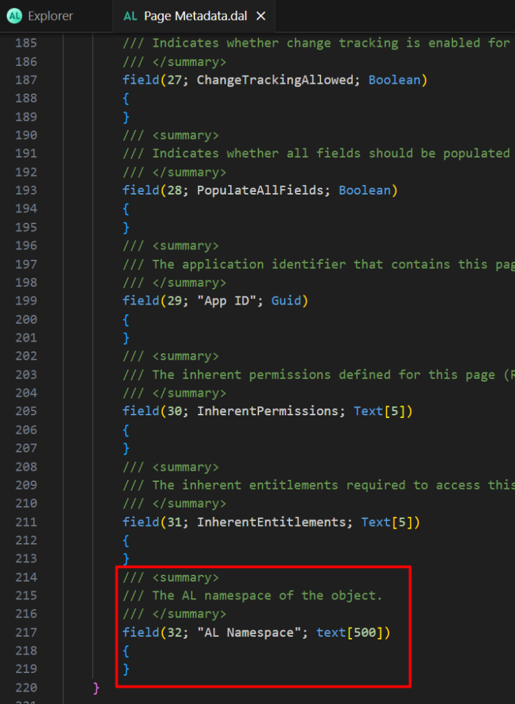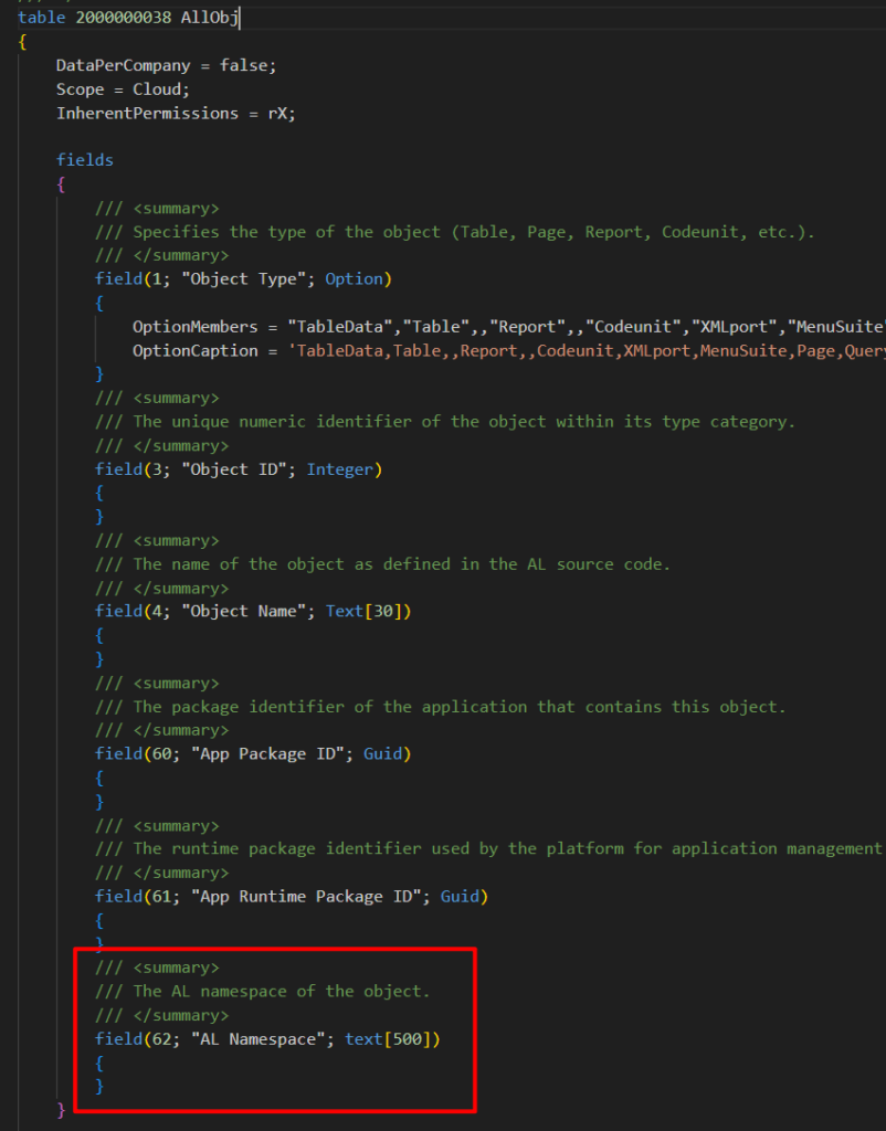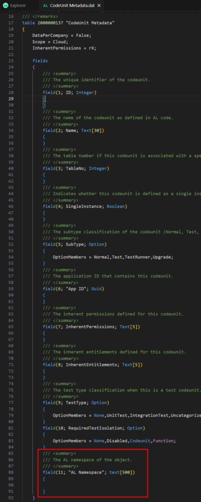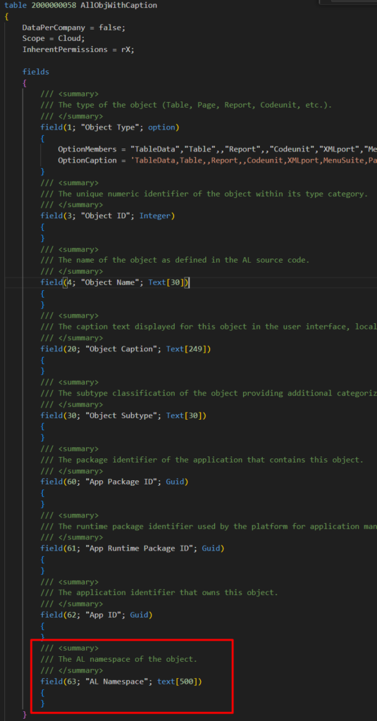 With this wave (BC27), Microsoft added a new “AL Namespace” field to these object metadata records. And detailed summaries/remarks are added for these tables and fields. Let’s see more details.