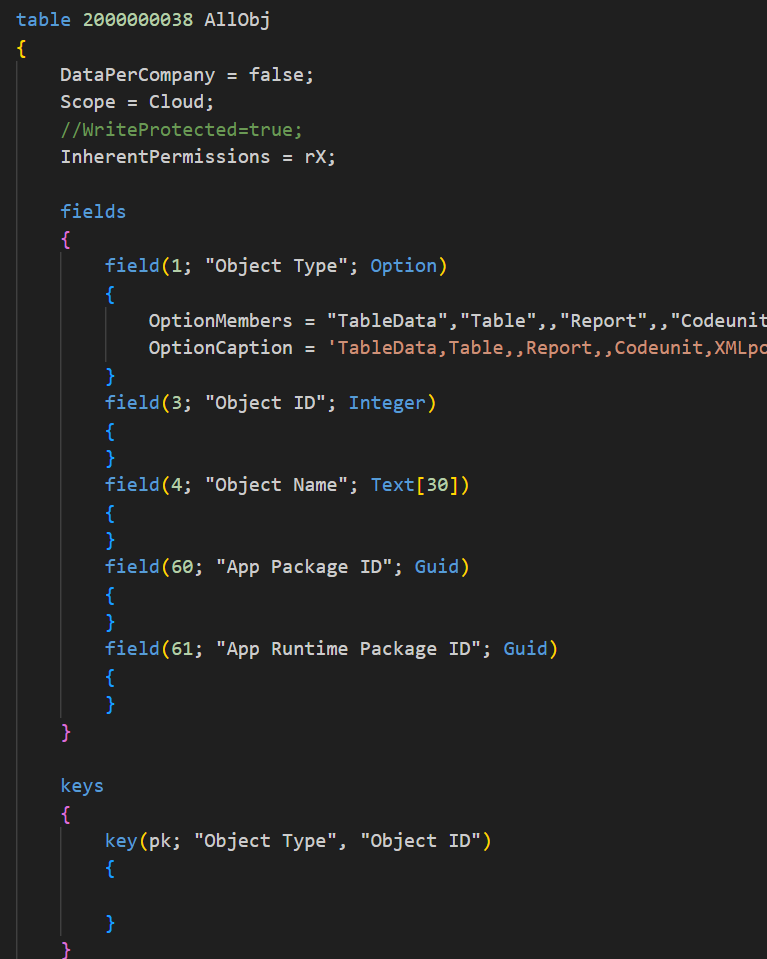 table 2000000038 AllObj: The AllObj table is a fundamental metadata source used by various system features for object discovery, navigation, and administrative purposes. It includes objects from the base application as well as installed extensions. This table is commonly used for building object browsers, search functionality, and metadata analysis tools.