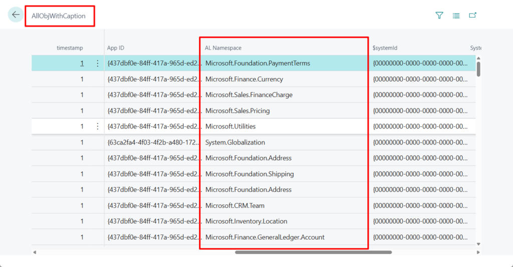 We can directly open the table to search for these AL Namespaces, or filter or process them from the code as in the Microsoft example.