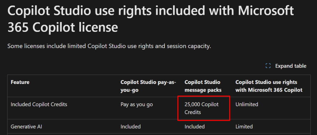 Next question, are there free Copilot Credits included with the license? I did some research and found that the Microsoft 365 Copilot license includes 25,000 Copilot Credits. More details: Copilot Studio use rights included with Microsoft 365 Copilot license