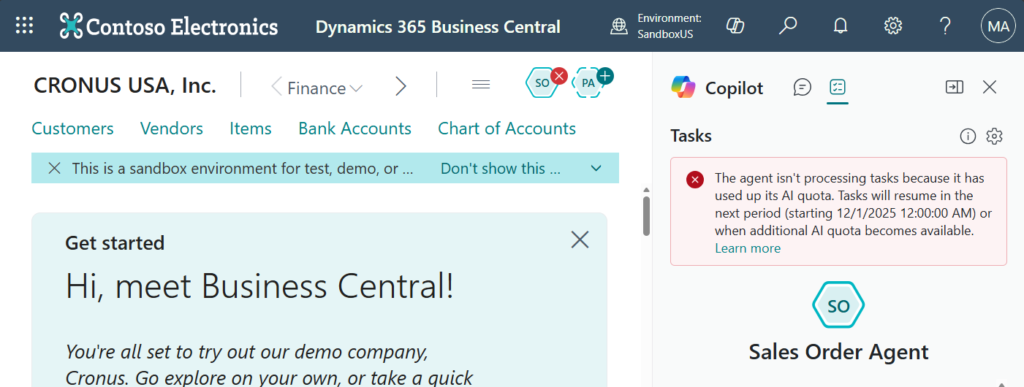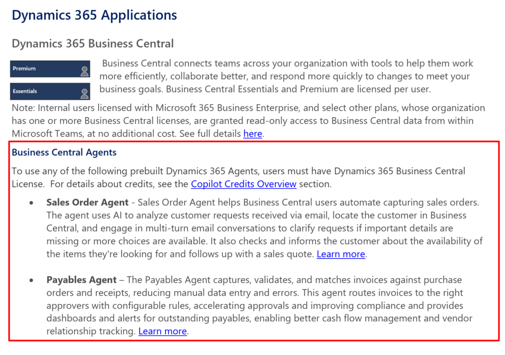 Selected agent capabilities in Business Central use consumption-based billing, charging per use. These capabilities use Copilot Credits for AI interactions and tasks, like retrieving information and responding to prompts.