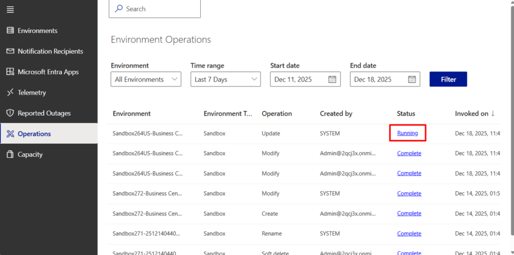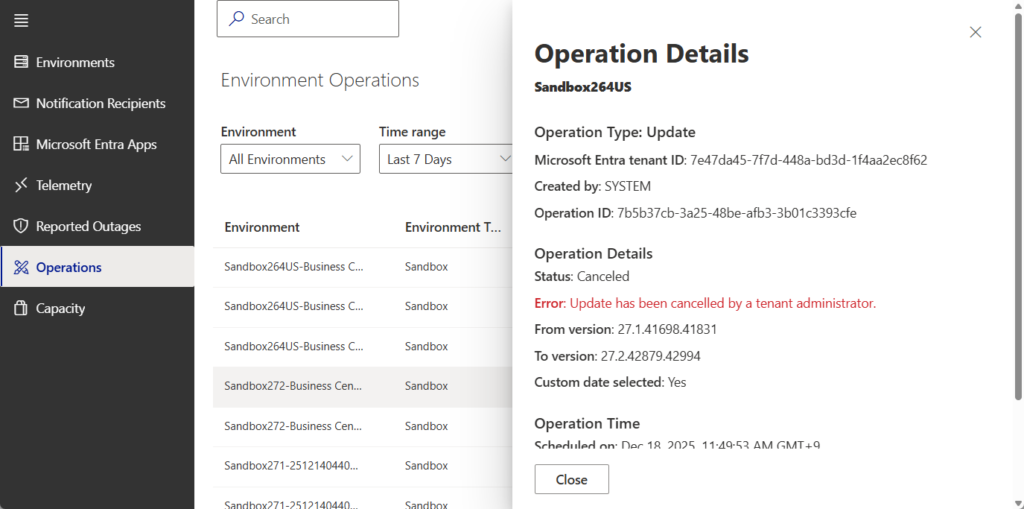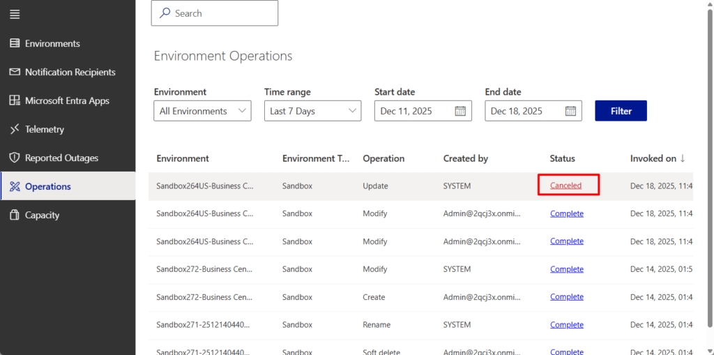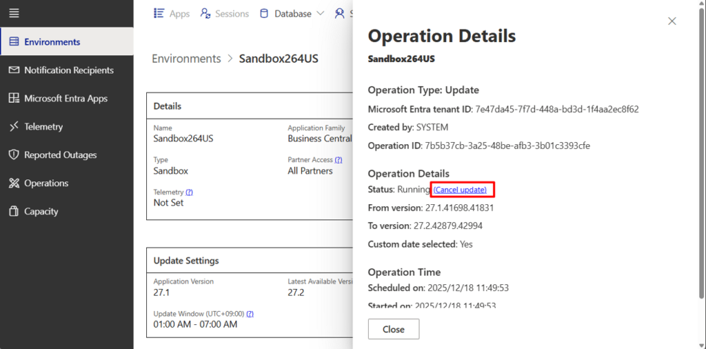 With this feature, you can now cancel a running update on an environment from the Business Central admin center. This gives you greater control and flexibility during update operations, allowing you to intervene when necessary—whether due to unexpected issues, timing conflicts, or other operational concerns.