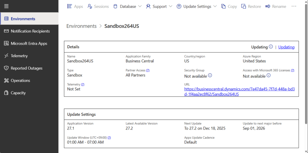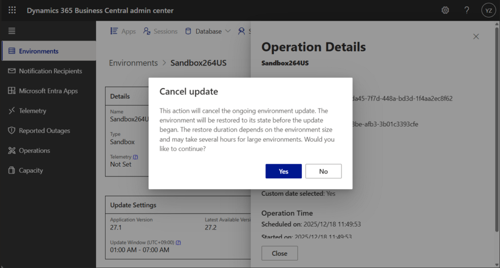 When you cancel an update, Business Central automatically starts a recovery operation to restore the environment to its pre-update state. You don’t need to do anything extra—your data stays safe, and your system remains stable.