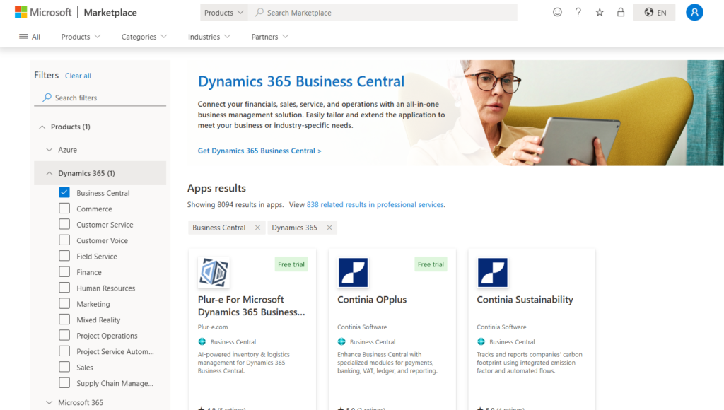 As you might know, you can get new apps from the marketplace at AppSource.microsoft.com. The marketplace offers all available apps for Business Central, plus apps and content packs for other Microsoft products.