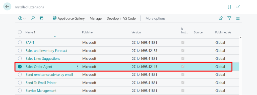- Find your AppSource extension, check the Installed version, for example, 27.1.41698.42115