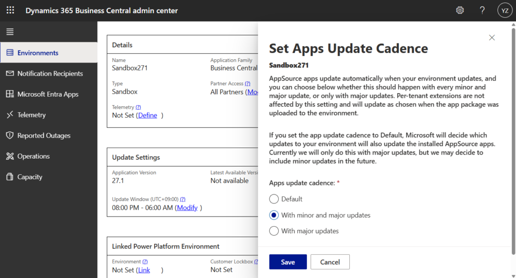 AppSource apps update automatically when your environment updates, and you can choose below whether this should happen with every minor and major update, or only with major updates. Per-tenant extensions are not affected by this setting and will update as chosen when the app package was uploaded to the environment.