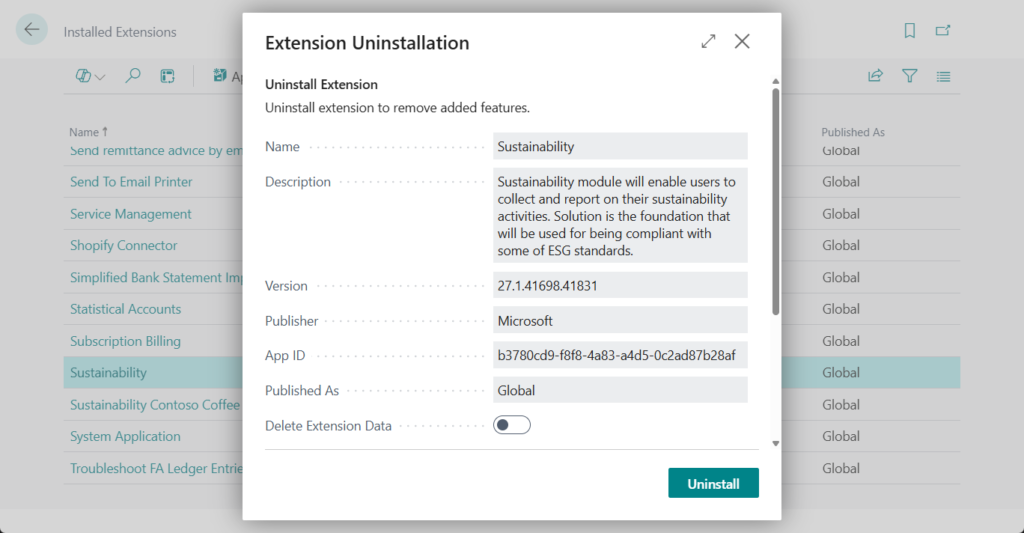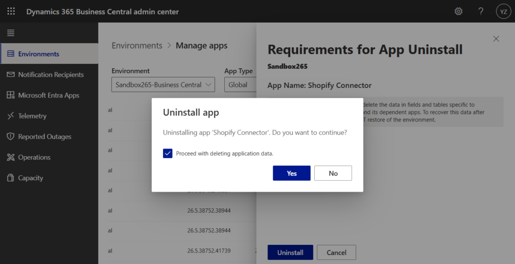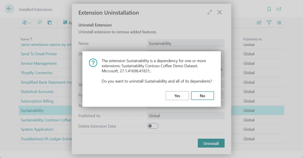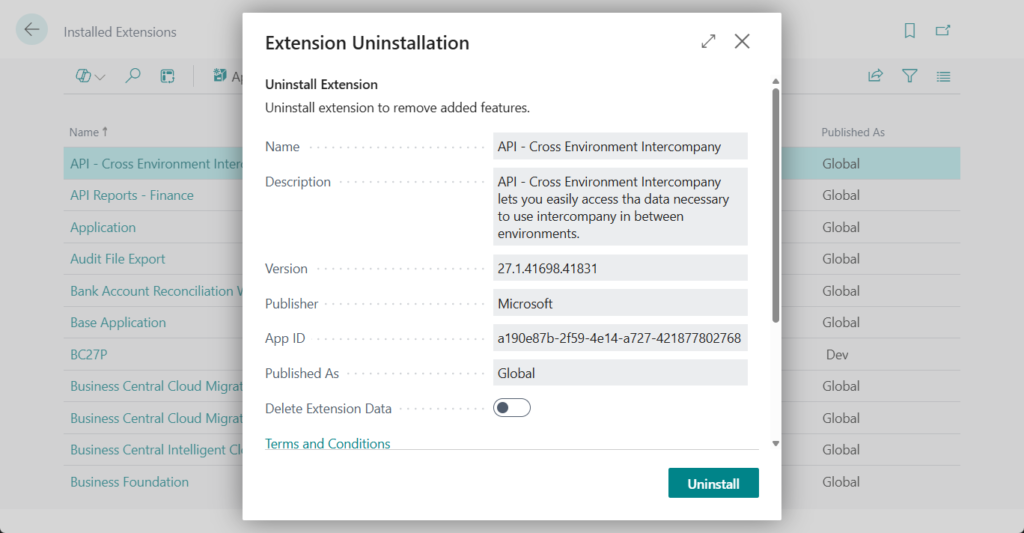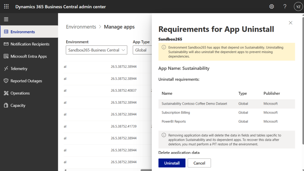 If other apps depend on the app that is being uninstalled, those dependent apps also have to be uninstalled. The Business Central administration center lists dependent apps in the App Uninstall pane and ask to confirm that these apps are to be uninstalled as well.